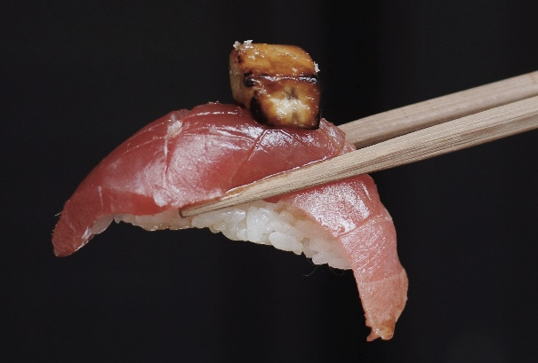 Tito nos comentó que iba a sacar los platos en el siguiente orden; de sabores menos intensos a más intensos, puesto que de esta manera disfrutaríamos más cada bocado y sabor, y fue todo un acierto. Empezamos con los nigiris, de salmón braseado, de atún con foie, de atún y caviar y de vieira trufada. Seguimos con los makis, el acevichado, un rol relleno de langostino furai, aguacate, cubierto con láminas de atún, bañado con salsa acevichada y coronado con cebolleta y el anticuchero, relleno de langostino furai, cebolla china tempurizada, cubierto de solomillo, bañado en salsa anticuchera y flambeado. Este último nos sorprendió muchísimo. Nunca había probado sushi con carne y me pareció exquisito. Mi recomendación personal, comerlo sin salsa de soja para apreciar bien todos los sabores del roll.